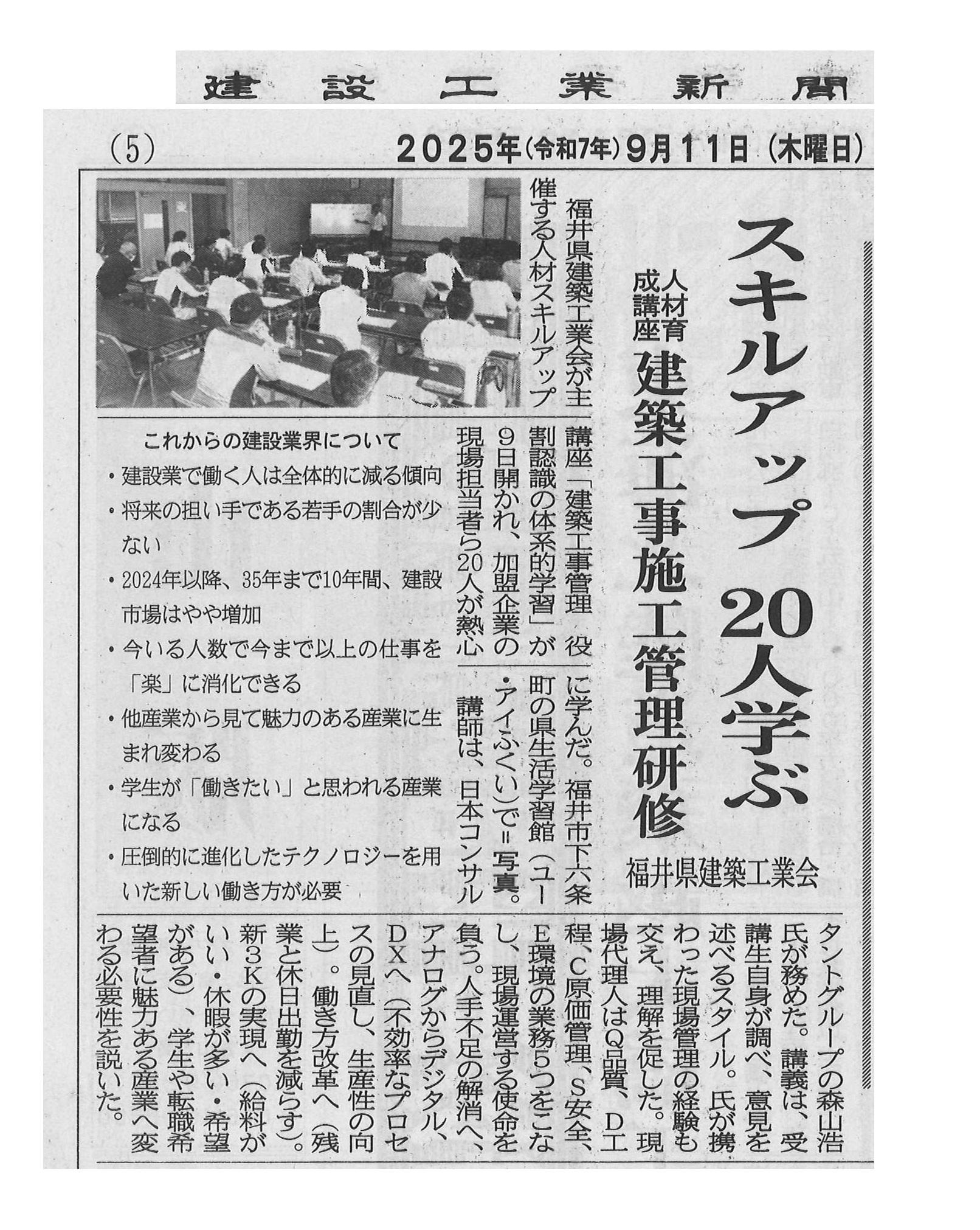 福井県建築工業会様が主催した「建築工事施工管理研修」では、若手20名に施工管理の基本から原価管理、デジタル活用までを私の実務経験から得たノウハウをお伝えさせていただきました。
